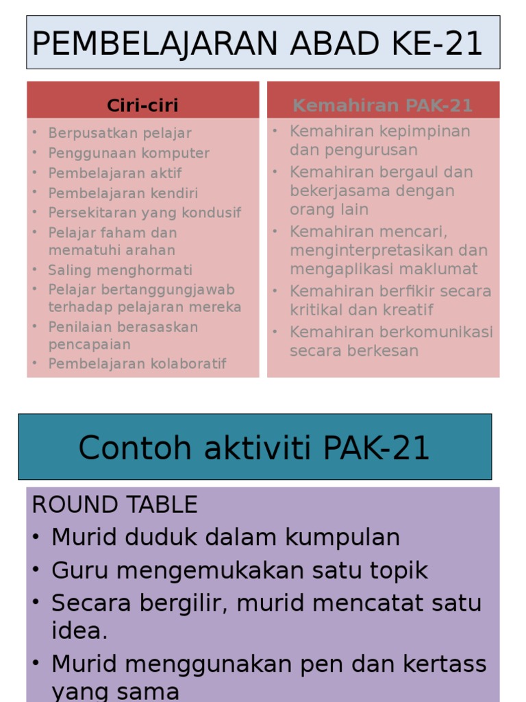 Kemahiran pembelajaran abad ke 21 dalam pendidikan dalam menjalani abad ke 21 kemahiran pedagogi seseorang guru perlu memiliki kemahiran pembelajaran dan inovasi kemahiran maklumat media dan teknologi dan kemahiran hidup. Elemen elemen tersebut adalah seperti yang berikut. Berikut adalah contoh contoh aktiviti pembelajaran berasaskan pembelajaran abad ke 21. Dalam menjalani abad ke 21 kemahiran pedagogi seseorang guru perlu memiliki kemahiran pembelajaran dan inovasi kemahiran maklumat media dan teknologi dan kemahiran hidup.