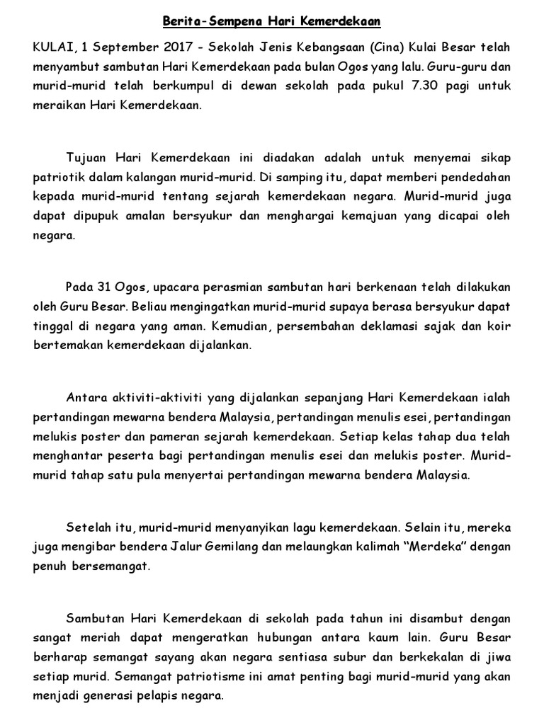 Oleh itu sambutan kemerdekaan diadakan di peringkat sekolah untuk memupuk semangat patriotik dalam jiwa pelajar agar sentiasa sayang dan cinta akan negara serta berusaha untuk mengekalkan kemerdekaan yang telah kita capai pada hari ini. Cadangan aktiviti bulan kemerdekaan 2020. Aktiviti sambutan bulan kemerdekaan di sekolahisu isu yang berkaitan dengan kemerdekaan negara kerap. Pengalaman menyaksikan sambutan hari kebangsaan.