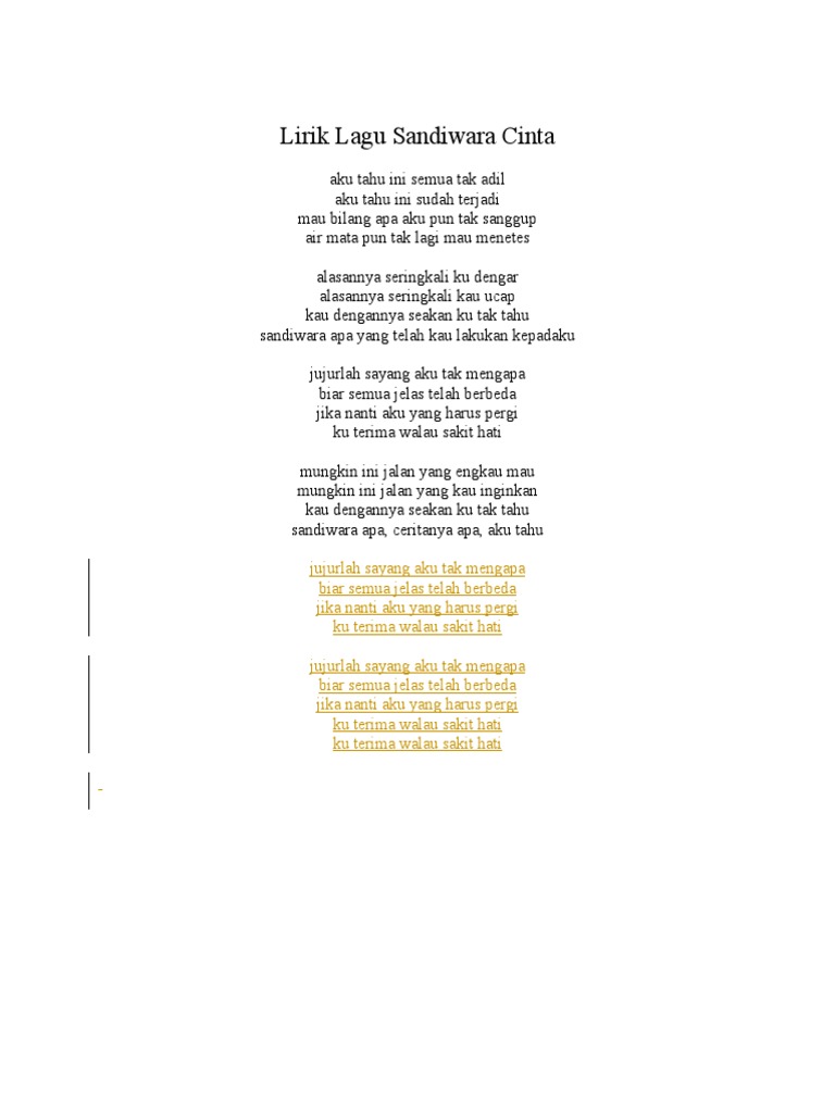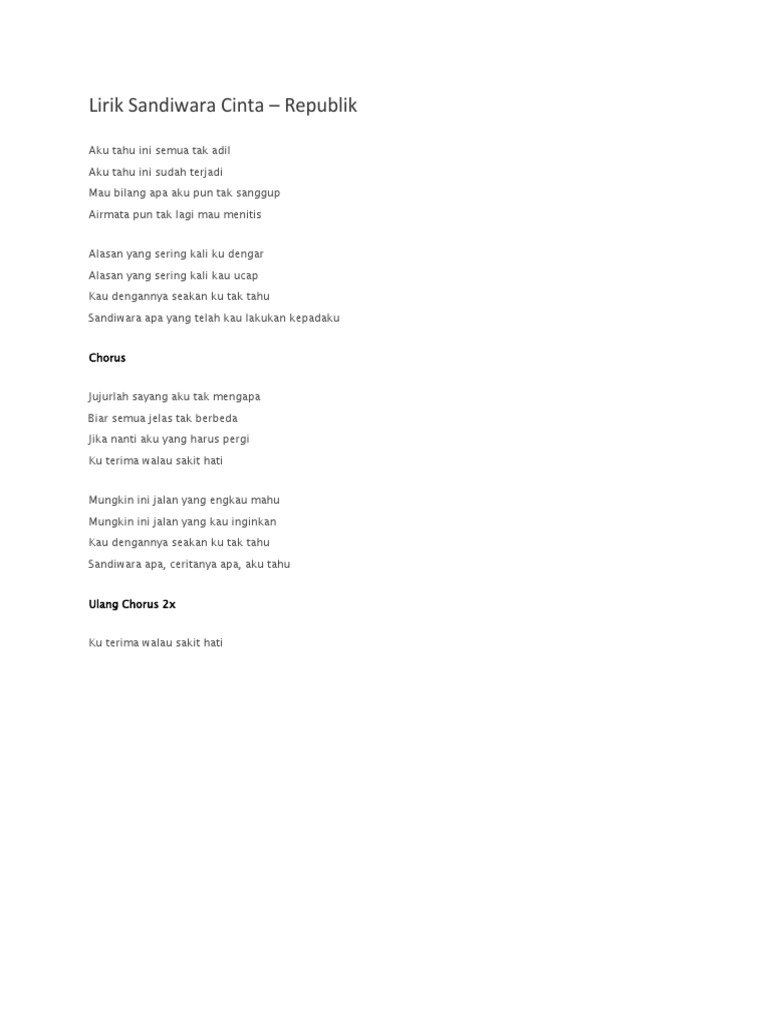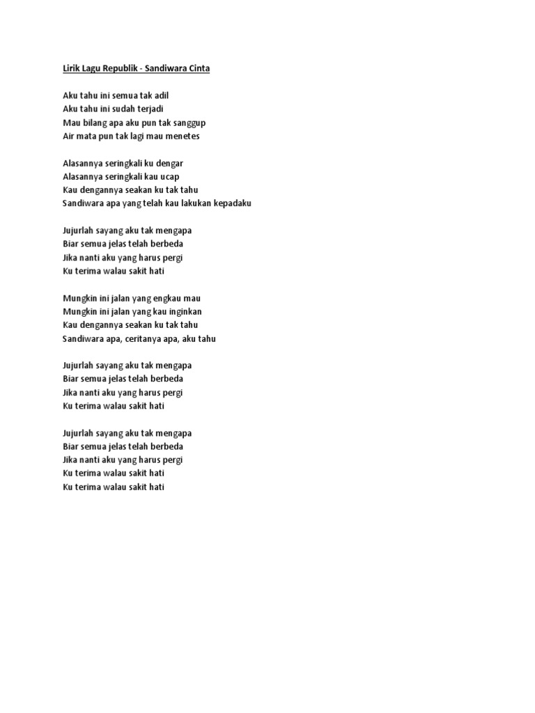 Lirik lagu sandiwara cinta republik. Jujurlah sayang aku tak mengapa. Am g d. Mungkin ini jalan yang engkau mau mungkin ini jalan yang kau inginkan kau dengannya seakan ku tak tahu sandiwara apa ceritanya apa aku tahu jujurlah sayang aku tak mengapa biar semua jelas telah berbeda jika nanti aku yang harus pergi ku terima walau sakit hati.