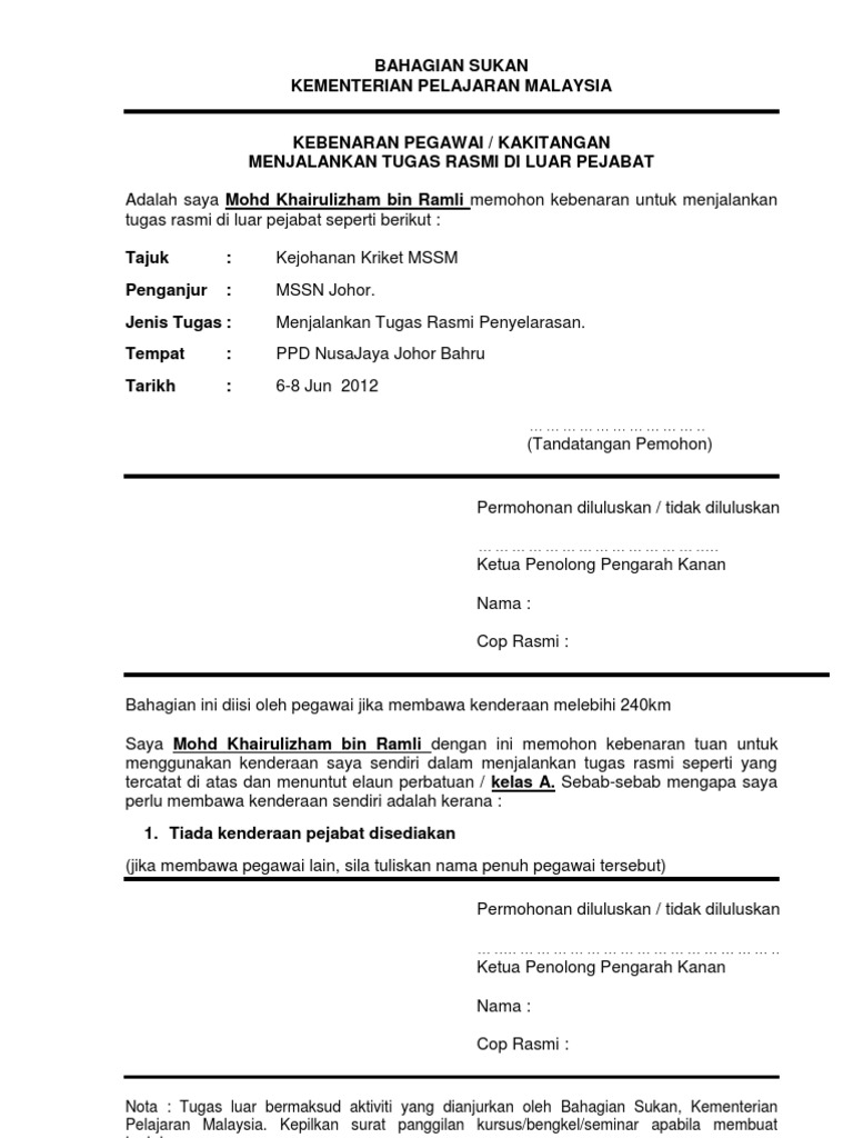 Dengan ini saya memohon kebenaran untuk menggunakan kenderaan saya sendiri dalam menjalankan tugas rasmi ke tempat tempat berikut dan menuntut elaun hitungan kilometer kelas a. Borang km 240 kebenaran bagi perjalanan yang jarak jai jh melebihi 240 km dari ibu pejabat tuntutan bui an nama pegawai dengan ini dibenarkan pegawai di atas menggunakan kenderaan sendiri pada tarikh seperti di dalam penyata tuntutan untuk menjalankan tugas tugas rasmi. Butiran pemohon nama pegawai jawatan jabatan unit gred gaji rm jenis kenderaan no. A beiiau dikehendaki menjaiankan tugas rasminya di beberapa.