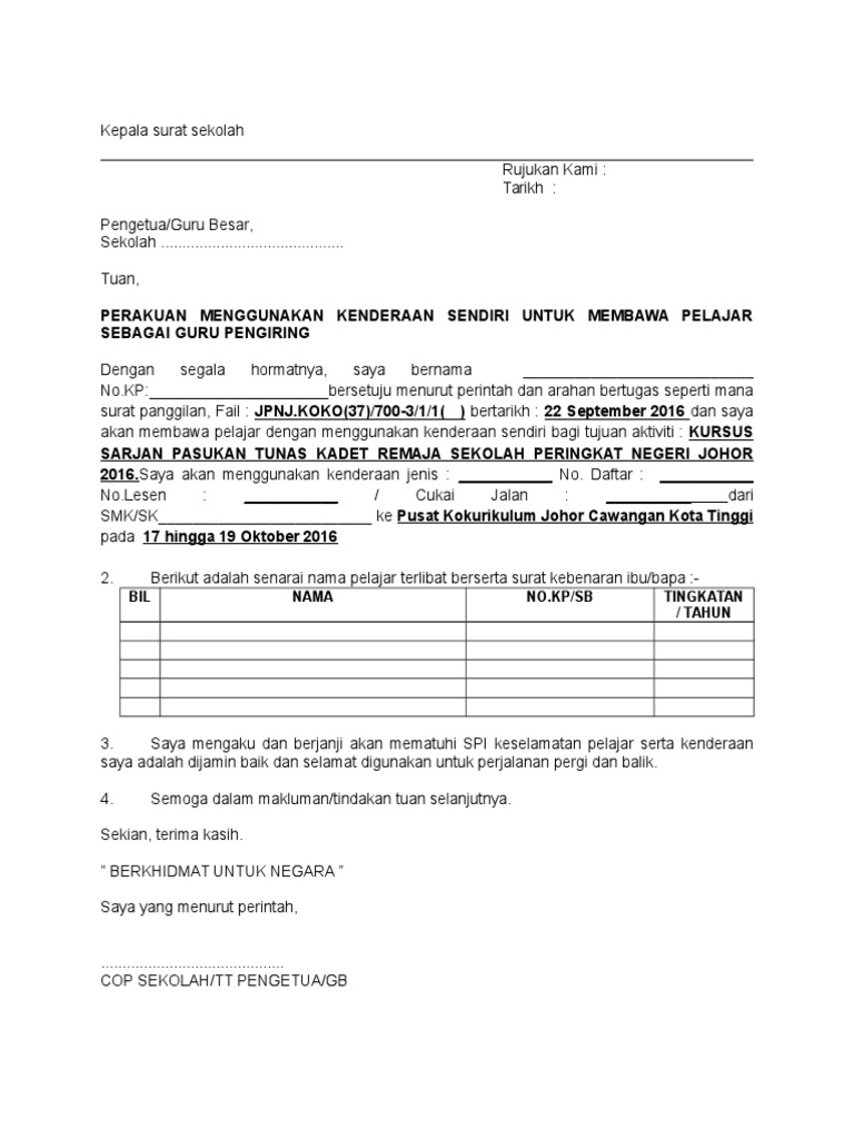Surat Kebenaran Membawa Murid Dgn Kenderaan Sendiri