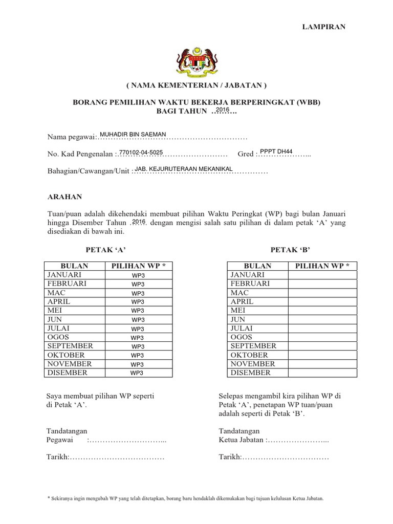 Borang pemilihan waktu bekerja berperingkat. 00 tarikh kuatkuasa 03 01 2017. Tuan puan adalah dikehendaki membuat pilihan waktu bekerja peringkat mengikut waktu peringkat wp1 wp2 wp3 bagi bulan januari hingga disember tahun 2012 dengan mengisi salah satu pilihan di dalam. Dengan mengisi salah satu pilihan di dalam petak a yang disediakan di bawah ini. Borang pemilihan waktu bekerja berperingkat wbb bagi tahun 2012 nama.