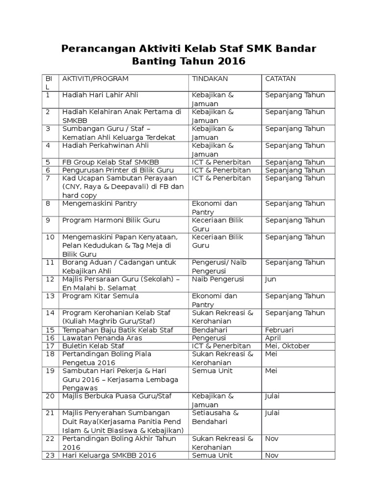 Perancangan Aktiviti Kelab Staf Smk Bandar Banting Tahun 2016