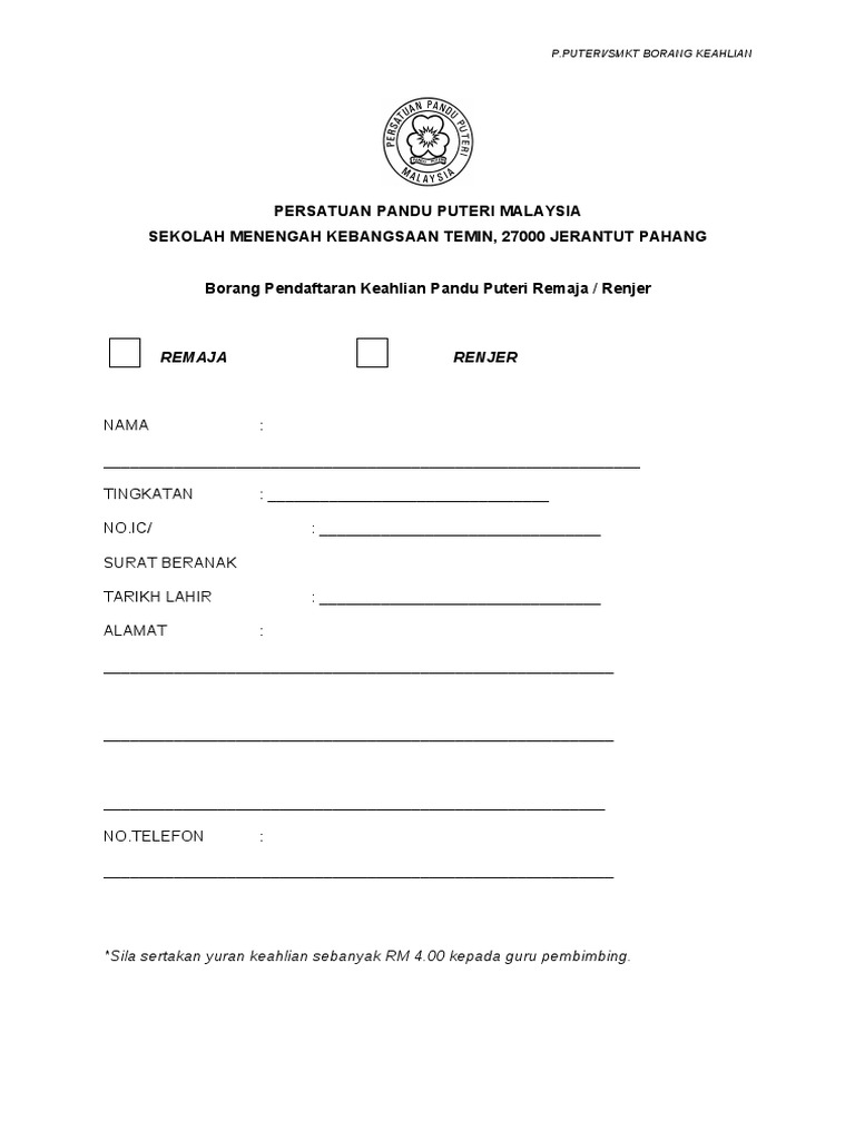 Borang Keahlian Persatuan Pandu Puteri Malaysia