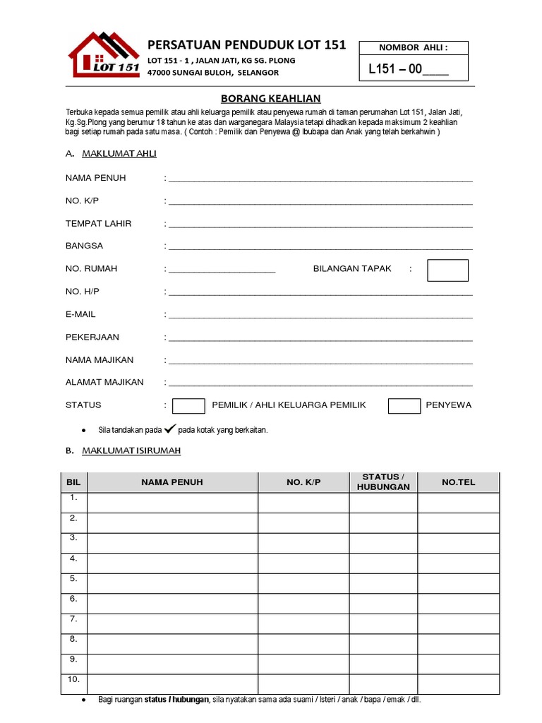 Persatuan Penduduk Lot 151 L151 00 Borang Keahlian