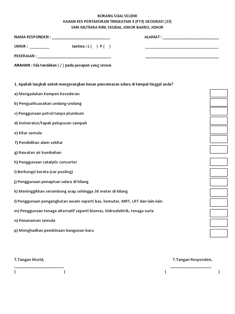 Borang Soal Selidik Geografi Pt3 2020 Contoh Terbaik