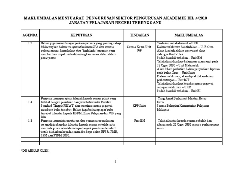 Contoh Maklum Balas Minit Mesyuarat Docx Document