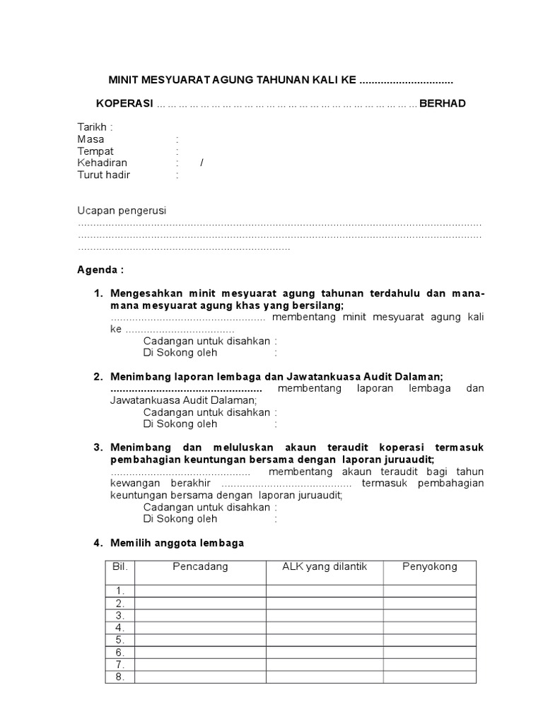 Contoh mesyuarat agung tahunan. Tatacara mesyuarat agung tahunan persatuan kelab pelajar 2017 1. Semua pegawai boleh dipilih semula setiap dua 2 tahun kecuali presiden. 9 30 pagi 1 30 petang tempat. Nama nama untuk jawatan diatas hendaklah dicadangkan serta disokong dan pemilikan akan dijalankan dengan cara mengundi oleh ahli ahli di dalam mesyuarat agung tahunan.