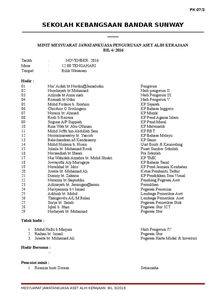 Contoh Minit Mesyuarat Aset Sekolah