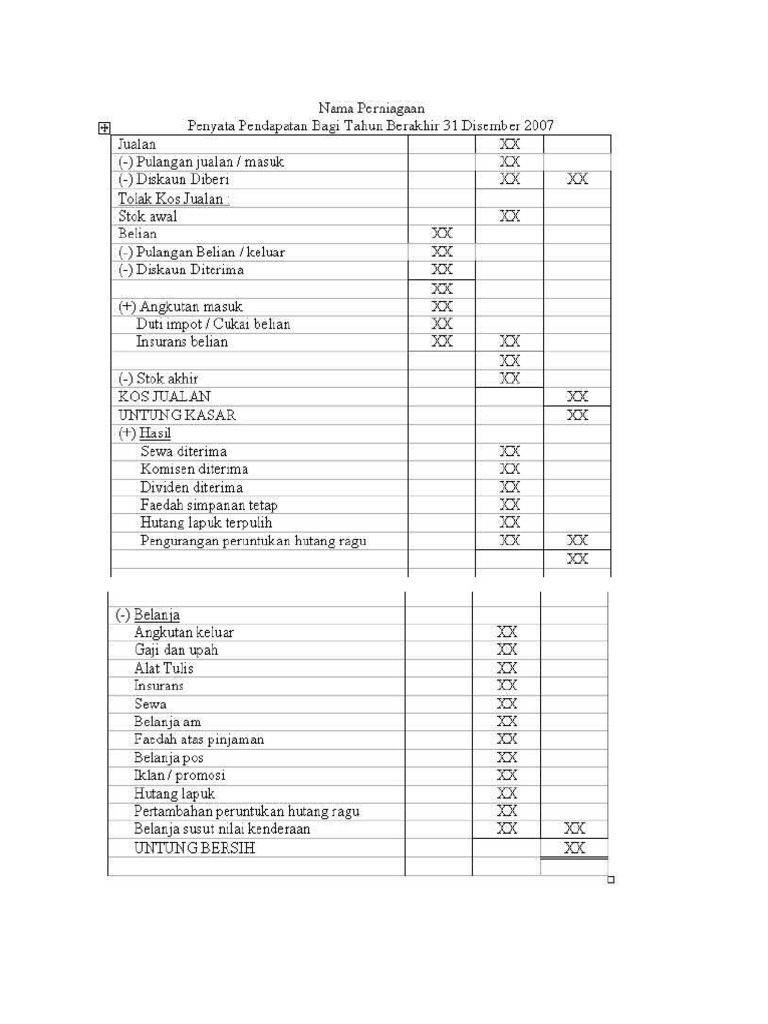 Format Penyata Pendapatan Dan Kunci Kira Kira Pdf Document