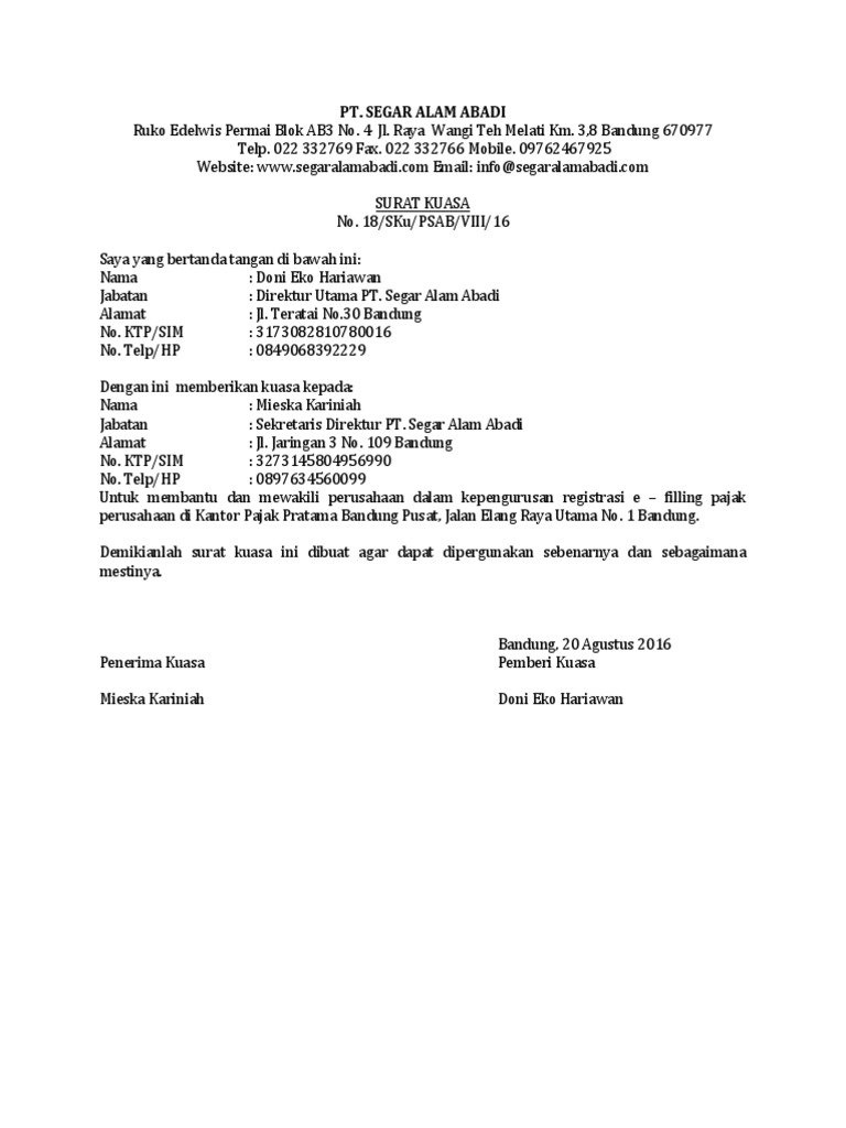 Contoh Surat Kuasa Perusahaan Untuk Mengurus Pajak