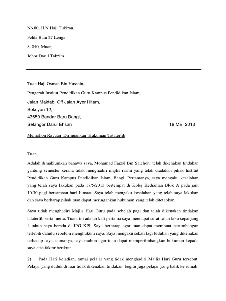 Contoh Surat Rasmi Rayuan Tindakan Tatatertib Contoh Songo