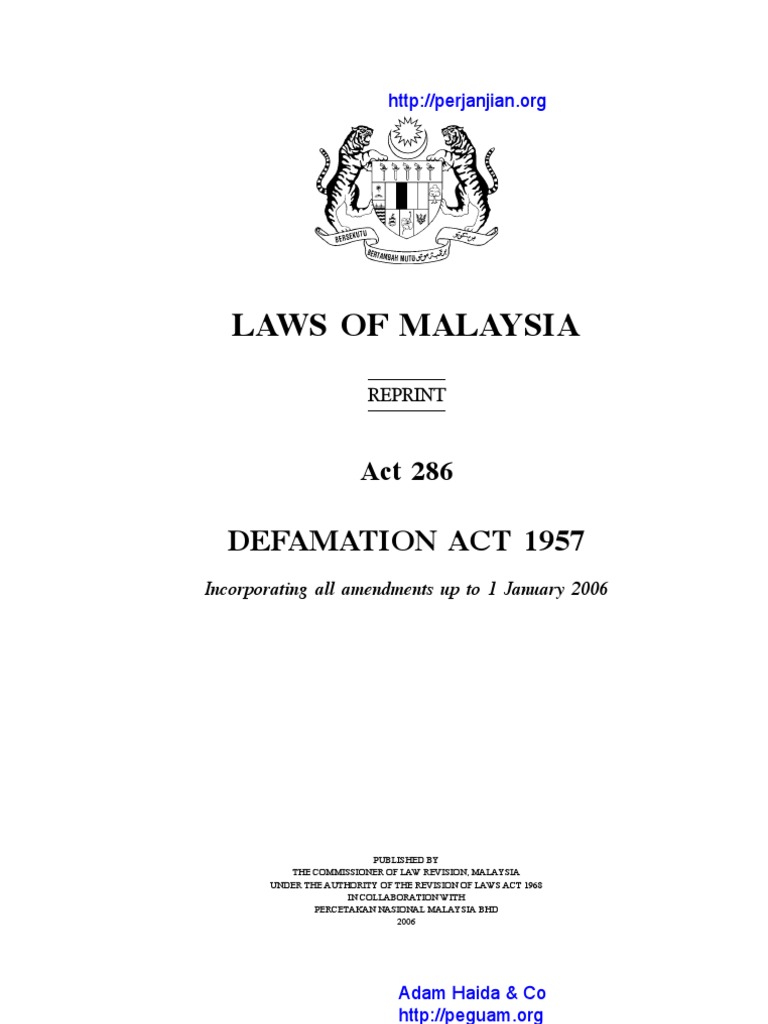 Act 286 Defamation Laws Of Malaysia Reprint Act 286 Defamation Act 1957 Incorporating All Amendments Up To 1 January 2006 Published By The Course Hero
