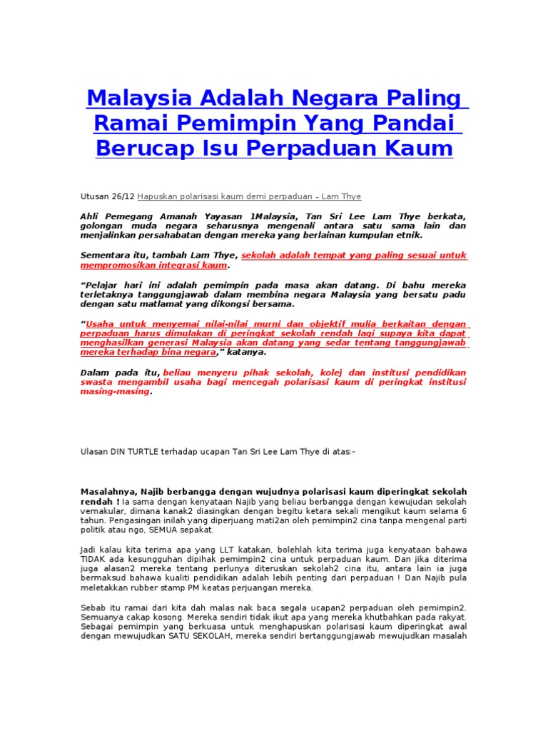 Malaysia Adalah Negara Paling Ramai Pemimpin Yang Pandai Berucap Isu Perpaduan Kaum