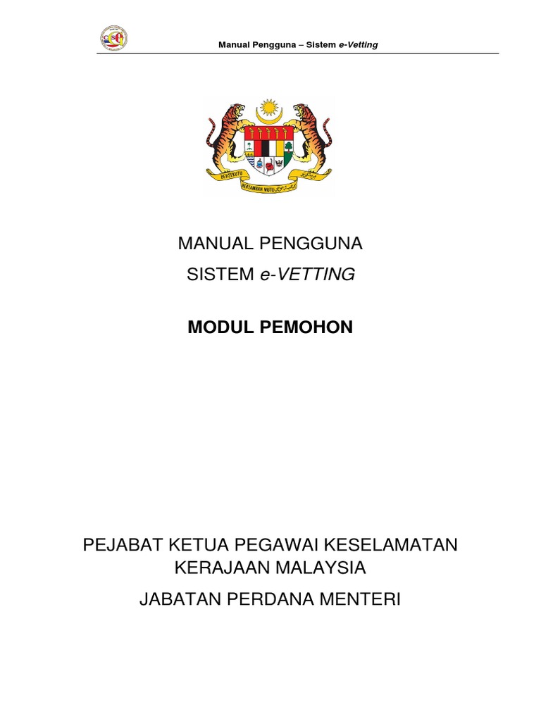 Manual Pengguna Sistem E Vetting 2 Pengguna Manual Pengguna Sistem E Vetting 2 0 Modul Pemohon Pejabat Ketua Pegawai Keselamatan Kerajaan Malaysia Jabatan Perdana Menteri