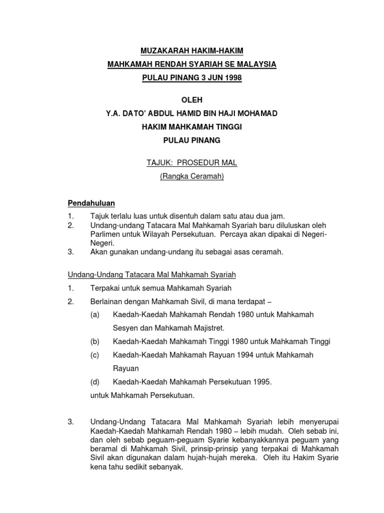 15 Muzakarah Hakim Hakim Mahkamah Rendah Syariah Se Malaysia Prosedur Mal Pdf