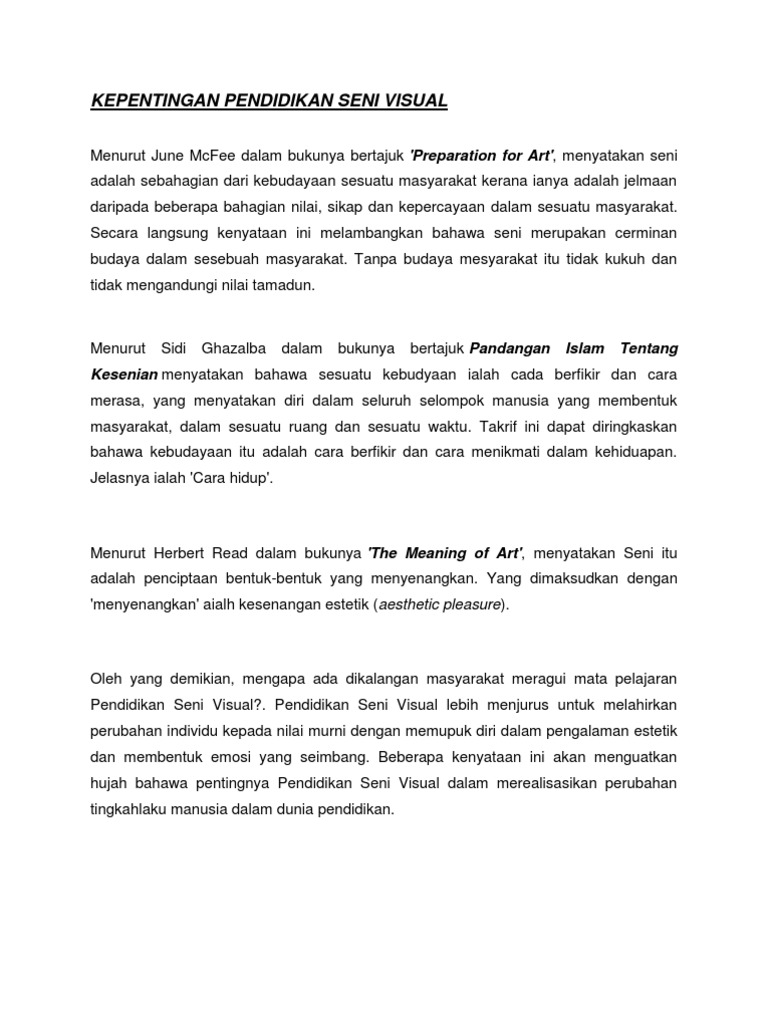 Kepentingan Pendidikan Seni Visual Kesenian Menyatakan Bahawa Sesuatu Kebudyaan Ialah Cada Berfikir Dan Cara
