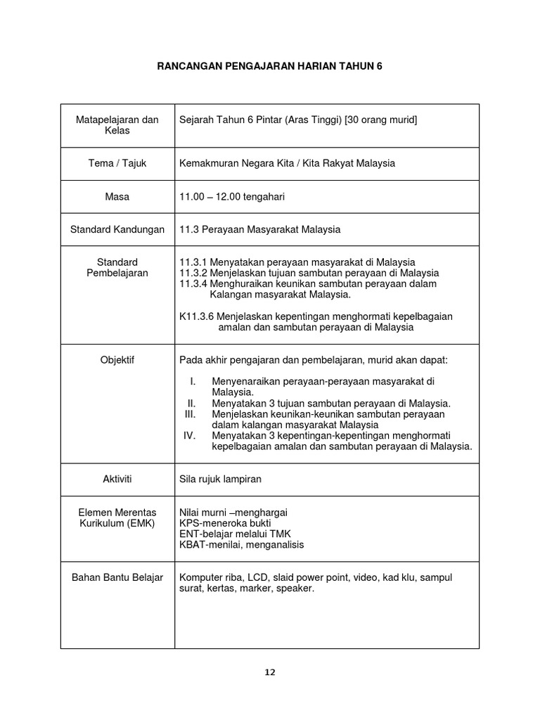 Rancangan Pengajaran Harian Sejarah Tahun 6