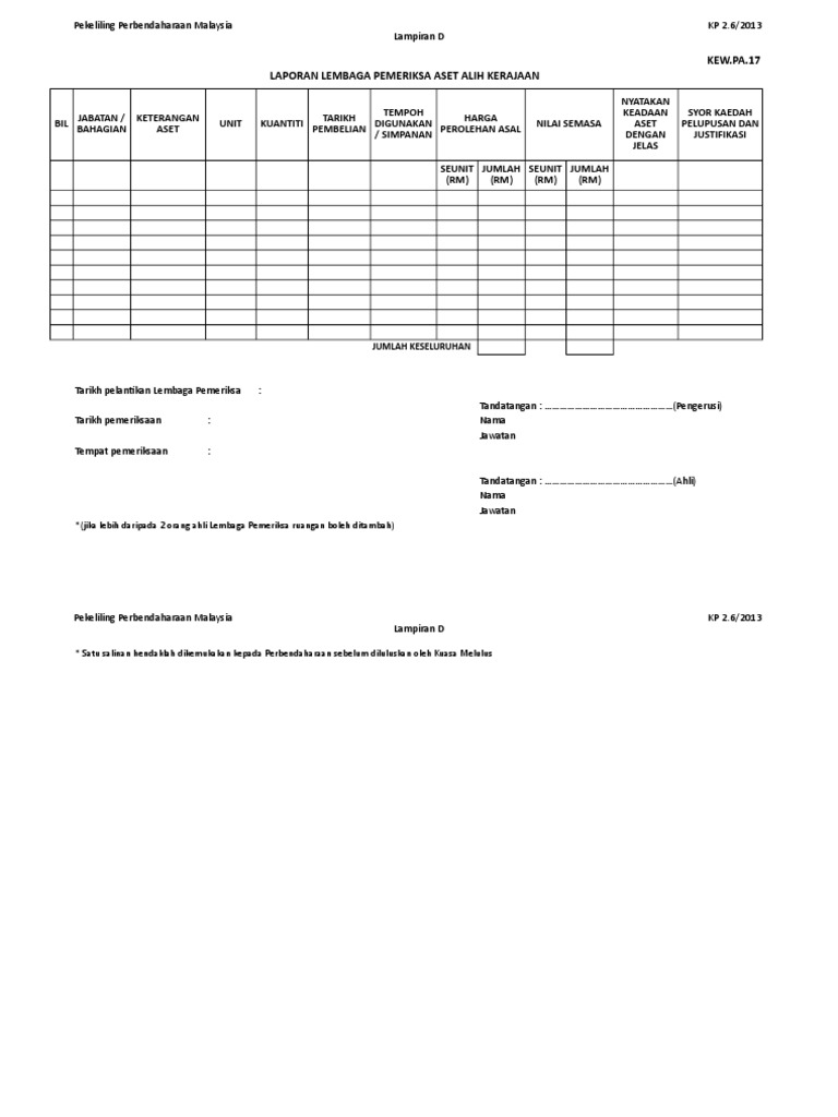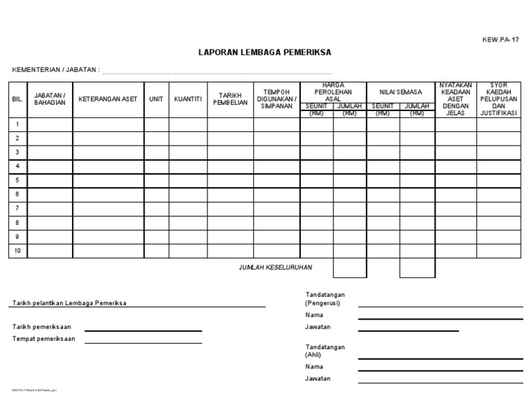 Kew pa 17 laporan lembaga pemeriksa aset alih kerajaan kementerian jabatan. Sukacitanya merujuk perkara di atas. Save save kew pa 17 baru for later. A jenis aset alih b jenama dan model c kuantiti d tarikh perolehan e harga perolehan asal f anggaran nilai semasa 2.