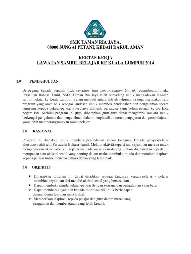 Contoh Kertas Kerja Lawatan Sambil Belajar Rasmi L