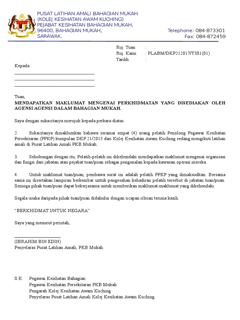 Pusat Latihan Amali Bahagian Mukah Kolej Kesihatan Awam Kuching Pejabat Kesihatan Bahagian Mukah 96400 Bahagian Mukah Sarawak Telephone Fax
