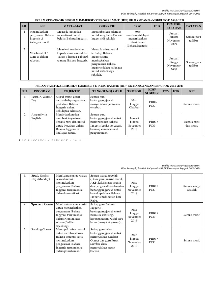 Highly Immersive Programme Hip Plan Strategik Taktikal Operasi Hip Sk Rancangan Sepupok 2019 2021