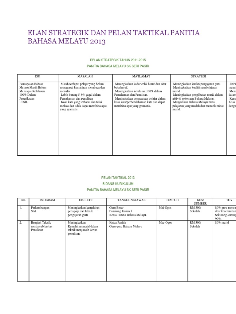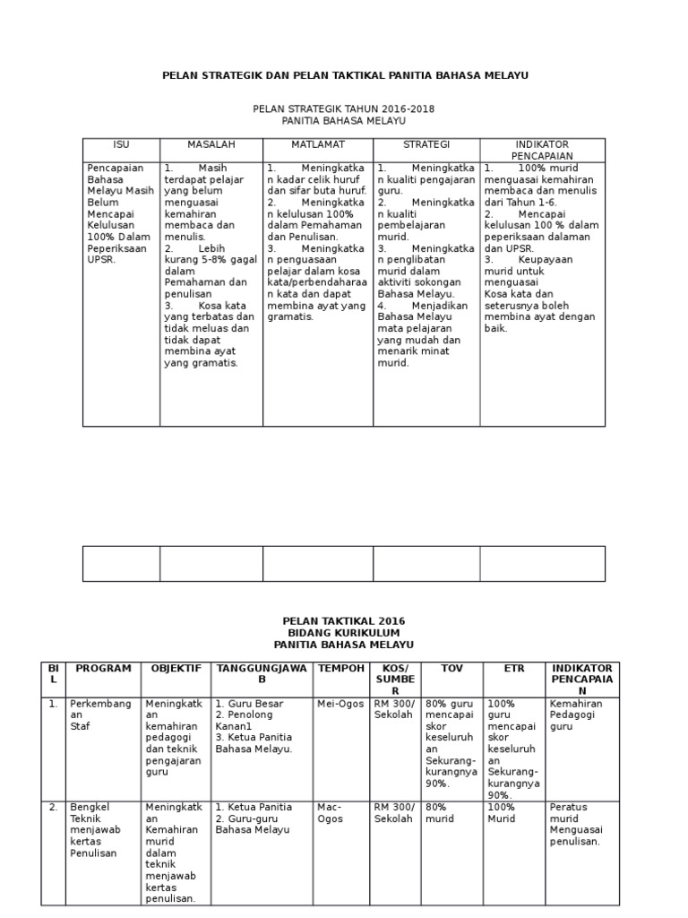 Doc Contoh Pelan Strategik Dan Pelan Taktikal Panitia Bahasa Melayu Sk Sulaiman Academia Edu