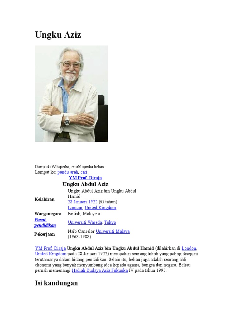 Ungku abdul aziz lahir 27 ogos 1947 merupakan anak kepada profesor diraja ungku aziz dan sharifah azah aziz ialah wanita yang pertama dilantik sebagai gabenor bank negara malaysia beliau juga dilihat sebagai salah seorang wanita yang begitu berkuasa di malaysia. Profesor diraja ungku abdul aziz bin ungku abdul hamid dilahirkan di london united kingdom pada 28 januari 1922 merupakan seorang tokoh yang paling disegani terutamanya dalam bidang pendidikan. He is the former vice chancellor of the university of malaya from 1968 to 1988 and he was awarded the title of professor diraja royal professor in 1978. Selain itu beliau juga adalah seorang ahli ekonomi yang banyak menyumbang idea kepada agama bangsa dan negara.