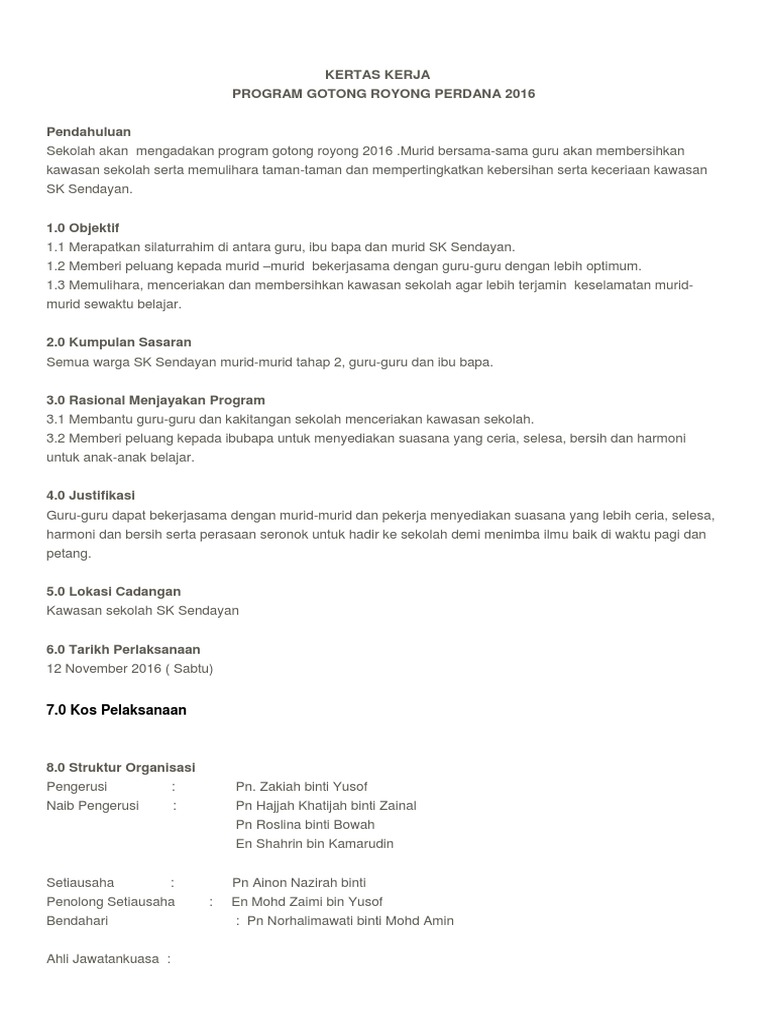 Kertas Kerja Program Gotong Royong Perdana 2016 7 0 Kos Pelaksanaan