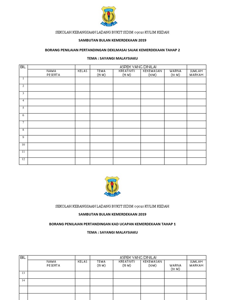 Sambutan Bulan Kemerdekaan 2019 Borang Penilaian Pertandingan Deklmasai Sajak Kemerdekaan Tahap 2 Tema Sayangi Malaysiaku