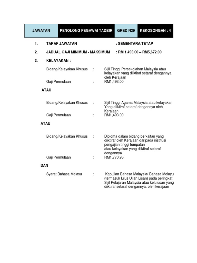 Jawatan Gred N29 Penolong Pegawai Tadbir Kekosongan 4