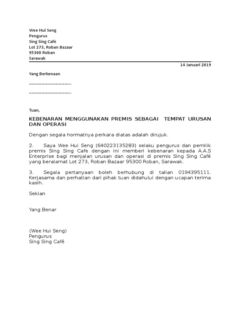 Contoh Surat Kebenaran Dari Pemilik Premis