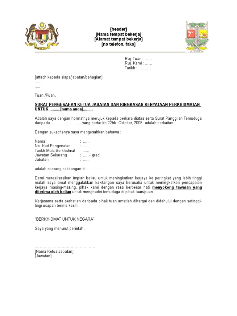 Format Surat Persetujuan Ketua Jabatan Untuk Menghadiri Temuduga