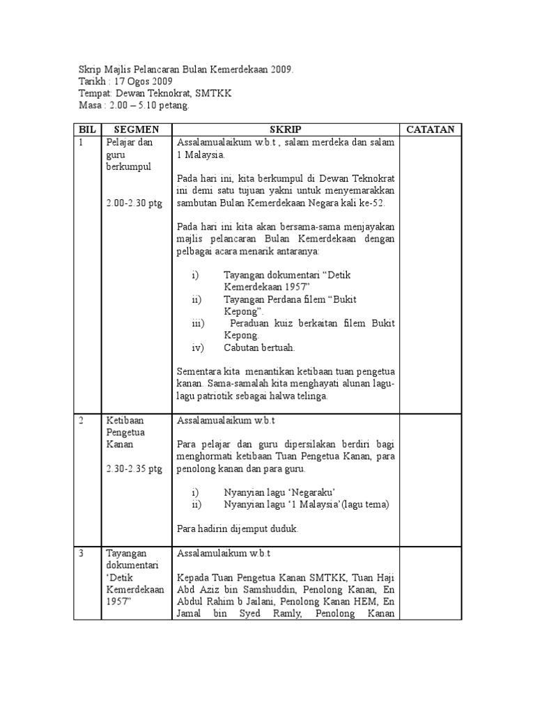 Skrip majlis pelancaran bulan kemerdekaan 2009. Teks pengacara majlis sambutan kemerdekaan teks pengacara majlis penutupan bulan kemerdekaan 2017. 1 teks pengacara majlis sambutan bulan kemerdekaan sk kota 2017 para murid yang dikasihi majlis akan bermula sebentar lagi untuk itu diminta semua untuk senyap dan tumpukan perhatian kepada majlis yang akan berlangsung. Teks ucapan pengacara majlis penutupan bulan kemerdekaan.