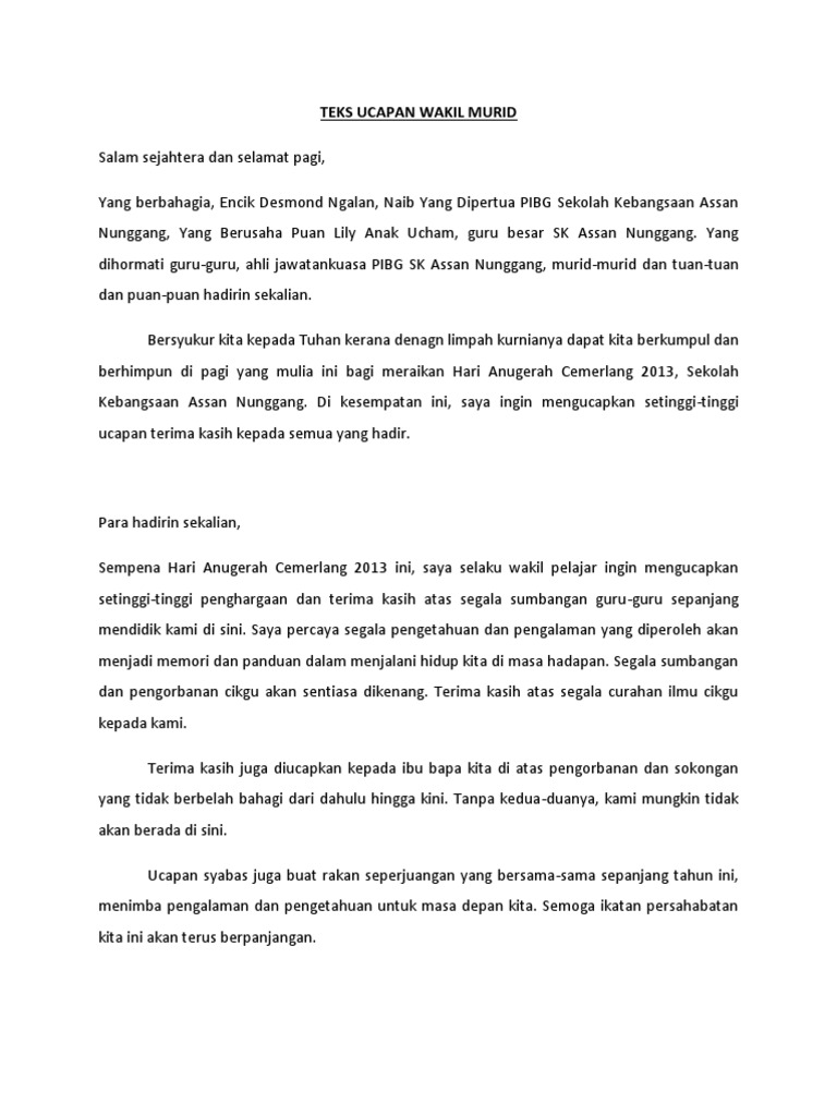 Teks Ucapan Wakil Murid