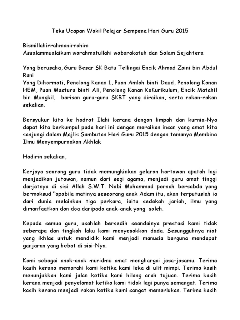 Ucapan Wakil Pelajar Sempena Hari Guru Contoh Bee