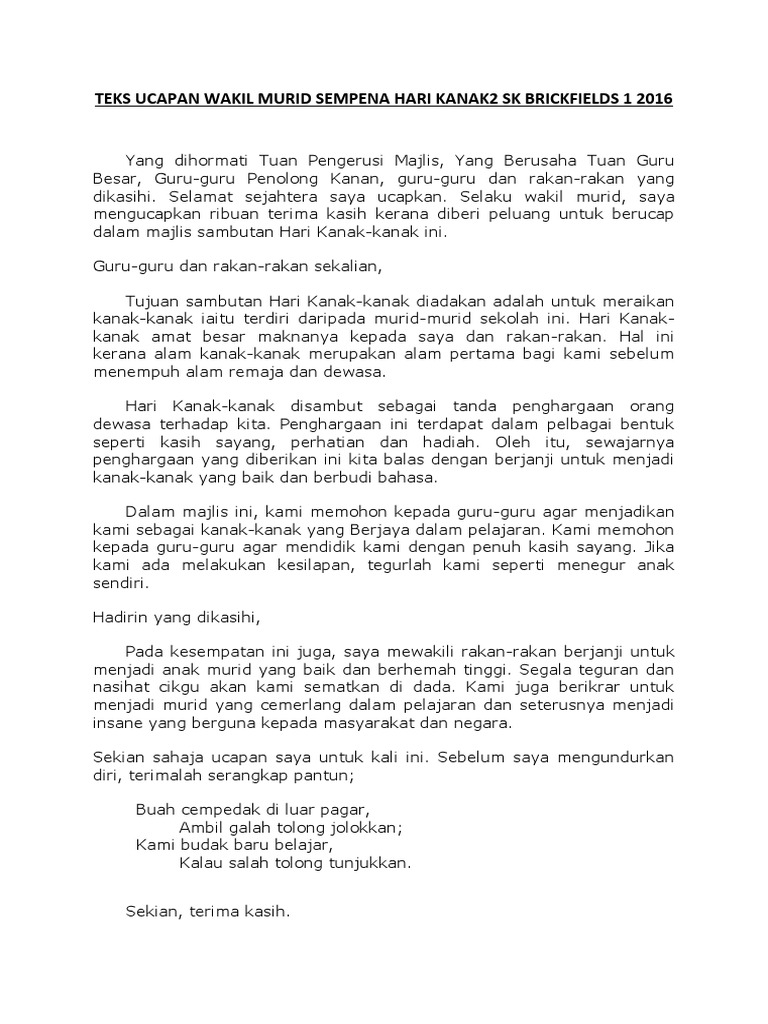 Teks Ucapan Wakil Murid Sempena Hari Kanak2 Sk Brickfields 1 2016